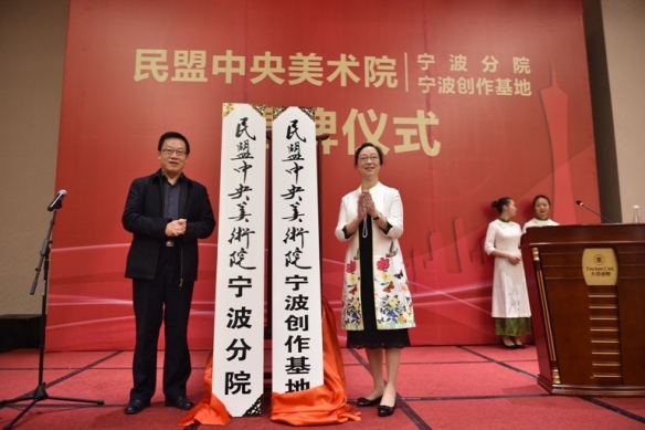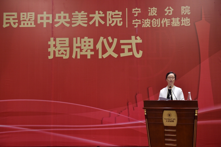 民盟中央宣传部部长曲伟宣读了民盟中央《关于同意成立民盟中央美术院宁波分院的批复》。她在讲话中指出,民盟与美术界有着广泛的联系和深厚的历史渊源,许多优秀盟员艺术家在当代中国美术界占有重要地位,宁波是潘天寿、沙孟海等盟员书画大师的故乡,具有重视书画艺术的良好传统和丰厚积淀。民盟中央美术院宁波分院和宁波创作基地的成立是宁波民盟美术界的一大文化盛事。希望民盟中央美术院宁波分院团结和凝聚宁波民盟美术界的力量,发挥书画领域的优势和特长,积极参与到文化事业大繁荣和大发展的生动实践中,认真开展好与社会各界艺术家和相关组织的学习交流活动,多与各省、市盟组织开展书画联展、巡展和文化交流活动,传承和弘扬优秀传统文化,为宁波文化事业的繁荣发展作出积极的贡献。