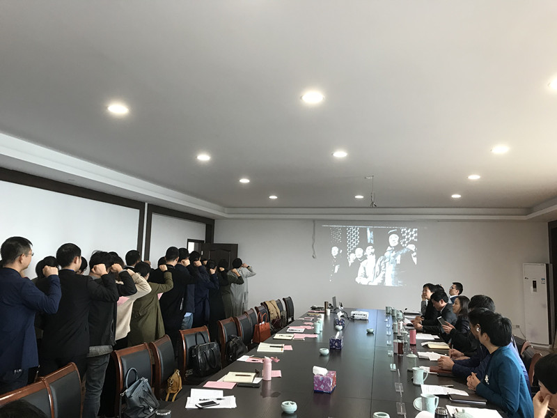 11月13日,慈溪盟员之家会议室,2014-2017年入盟的32位慈溪盟员右手握拳,面向中央人民政府副主席、民盟中央主席张澜同毛泽东等中共中央和国家领导人在天安门城楼上参加开国大典的照片庄严宣誓。